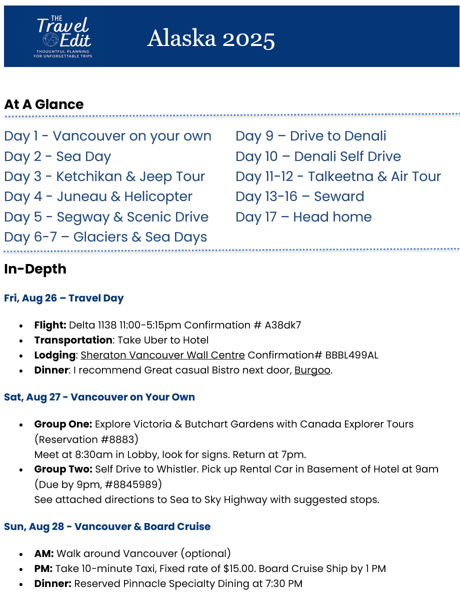 Worried about cost? My services typically don’t cost you extra—I’m compensated by hotels, tour providers, and transportation partners. If a trip falls outside that model or needs deeper support, I’ll outline any fees up front and you can decide.